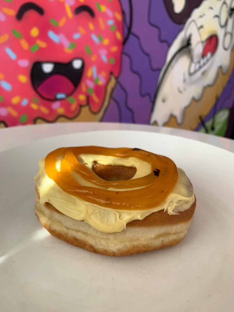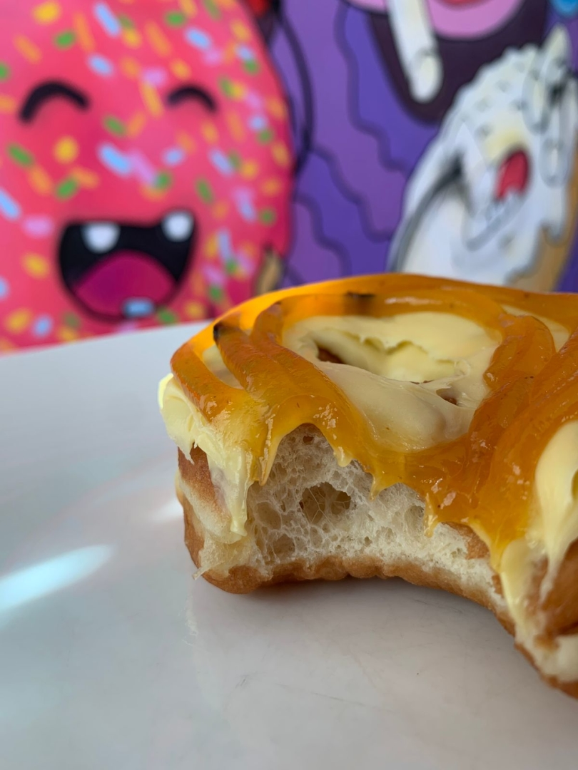 Donut fofinho coberto com creme de maracujá e finalizado com geleia de maracujá com sementes. Opção perfeita para o verão.