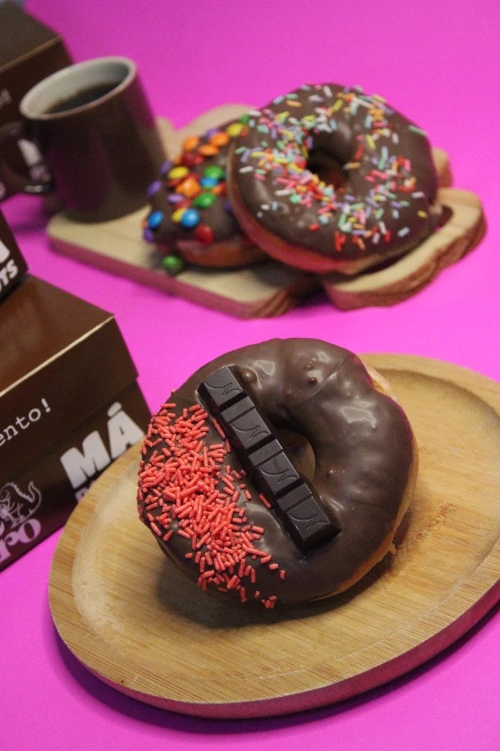 Donut com recheio generoso de brigadeiro, e coberto com creme de avelã, finalizada com morango.