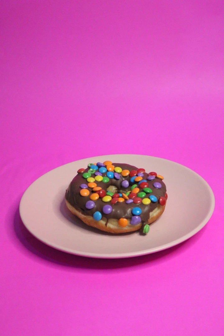 Donut Especial de Chocolate Preto com Confeito tipo MMS e recheio de Brigadeiro